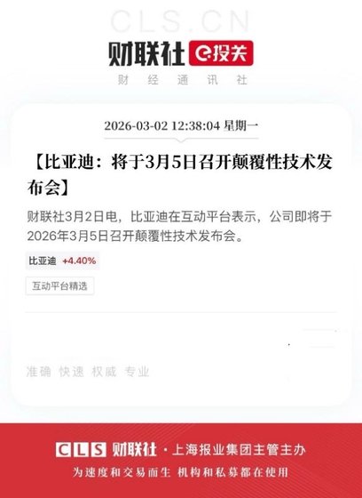 技術層面的布局同樣釋放積極信號。3月2日,比亞迪在互動平臺宣布將于3月5日舉行顛覆性技術發布會,相關消息發布后市場反應迅速,公司A股當日上漲8.36%。資本市場的反饋,顯示出投資者對企業硬核技術實力的高度認可與信心。