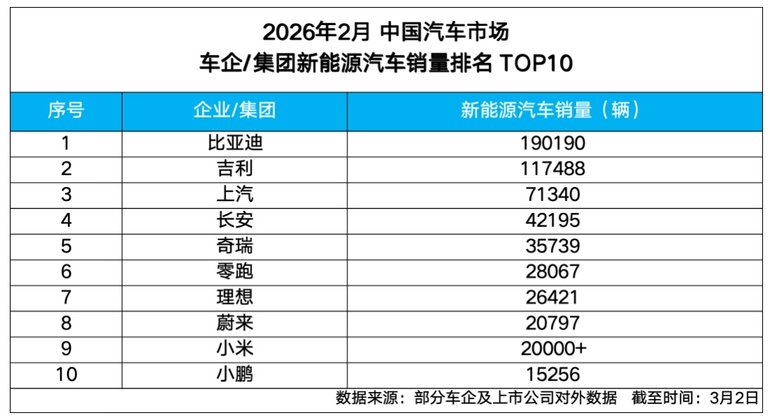 2026年開局,中國新能源汽車市場競爭格局進(jìn)一步明朗。根據(jù)車企及上市公司對外披露的數(shù)據(jù),比亞迪集團(tuán)2月新能源汽車銷量達(dá)190190輛,再度位居行業(yè)首位,在主流車企中持續(xù)保持明顯領(lǐng)先優(yōu)勢,以穩(wěn)定而強(qiáng)勁的表現(xiàn)鞏固頭部地位。