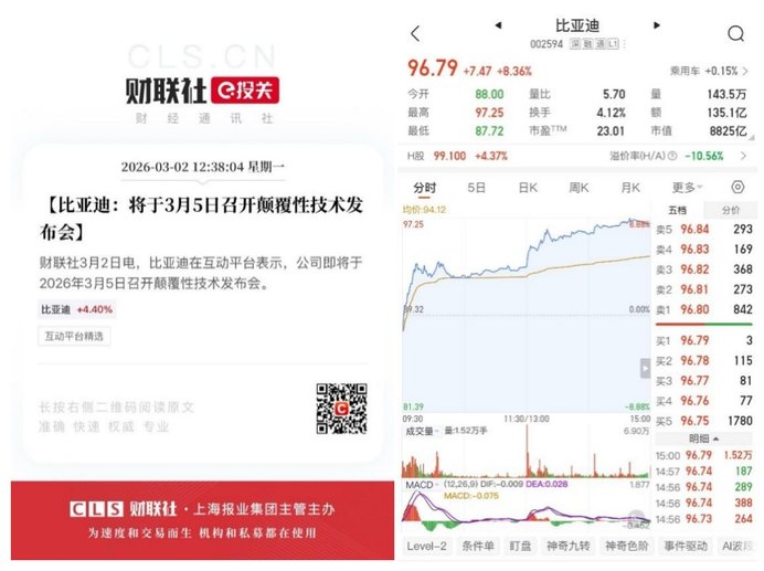 技術(shù)層面的布局同樣釋放積極信號。3月2日,比亞迪在互動平臺宣布將于3月5日舉行顛覆性技術(shù)發(fā)布會,相關(guān)消息發(fā)布后市場反應(yīng)迅速,公司A股當(dāng)日上漲8.36%。資本市場的反饋,顯示出投資者對企業(yè)硬核技術(shù)實(shí)力的高度認(rèn)可與信心。