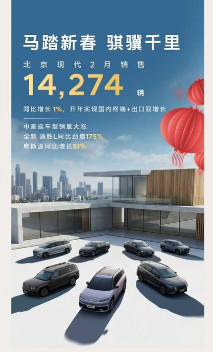 正是得益于這份深厚積淀與用戶信賴,北京現代2月共銷售14,274輛,同比增長1%,開年實現國內終端+出口雙增長;中高端車型銷量大漲,其中全新途勝L同比勁增175%,庫斯途同比增長51%,迎來馬年開門紅。
