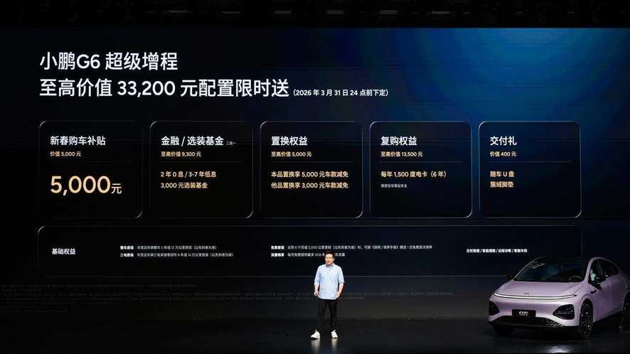(2026年3月6日,廣州)今日,小鵬汽車舉行小鵬G6超級(jí)增程上市發(fā)布會(huì),新車定位六項(xiàng)全能AI增程SUV,以“六項(xiàng)全能 一步到位”為核心,憑借同級(jí)綜合續(xù)航第一、同級(jí)補(bǔ)能速度第一、同級(jí)車端有效算力第一、同級(jí)最強(qiáng)底盤(pán)系統(tǒng)、同級(jí)最強(qiáng)主動(dòng)安全和同級(jí)得房率第一的六大核心優(yōu)勢(shì),打造真正滿足用戶全場(chǎng)景需求的國(guó)民車。本次發(fā)布小鵬G6超級(jí)增程1704 Max,官方指導(dǎo)價(jià)為18.68萬(wàn)元,用戶可選裝兩個(gè)智能升級(jí)包,加購(gòu)12,000元升級(jí)為Ultra SE版本、加購(gòu)20,000元升級(jí)為Ultra版本。即日起至2026年3月31日24點(diǎn)前下定小鵬G6超級(jí)增程,可享至高價(jià)值33,200元限時(shí)權(quán)益禮包,包括5,000元新春購(gòu)車補(bǔ)貼、至高價(jià)值9,300元金融/選裝基金(二選一)、至高價(jià)值5,000元置換權(quán)益、至高價(jià)值13,500元復(fù)購(gòu)權(quán)益和價(jià)值400元交付禮。