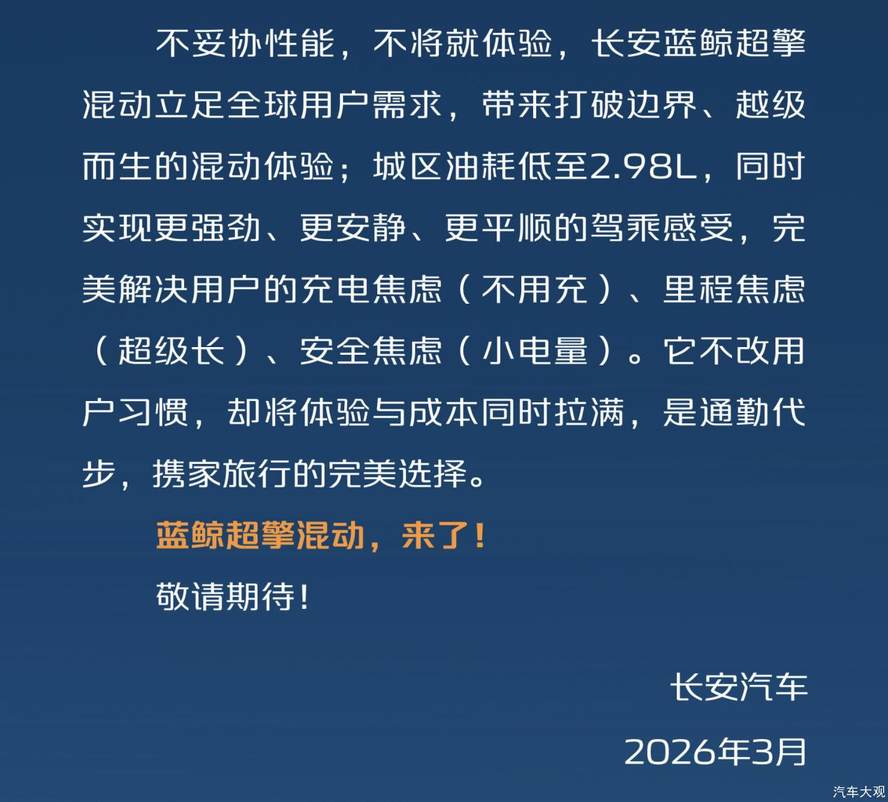 3月12日,長安汽車官方發(fā)表《長安藍(lán)鯨超擎混動》宣言,字字鏗鏘、句句千鈞,正式官宣其新一代混動技術(shù)名稱——“藍(lán)鯨超擎混動”。該技術(shù)將在不改變用戶習(xí)慣的前提下,帶來媲美新能源車的出行體驗,開啟下一個新燃油時代。